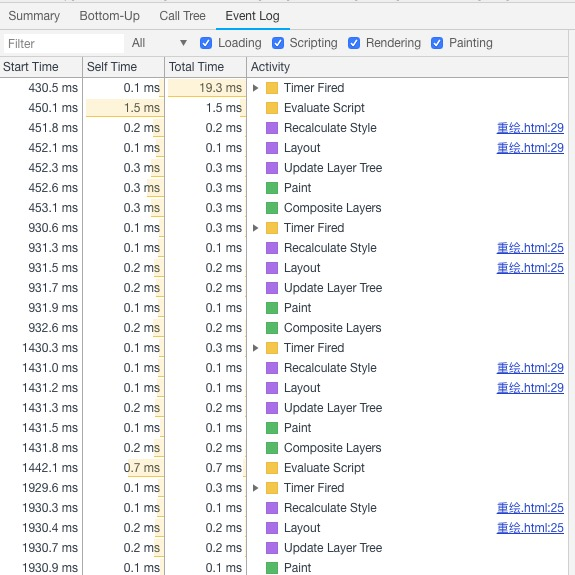 大概可以看到,Recalculate Style -> Layout -> Update Layer Tree -> Paint -> Composite Layers 这个过程在循环进行,触发的目标代码是第25行代码合29行代码,也就是box.style.borderWidth = '50px';和box.style.cssText = 'border: ' + borderWidth + 'px solid' + borderColor;。