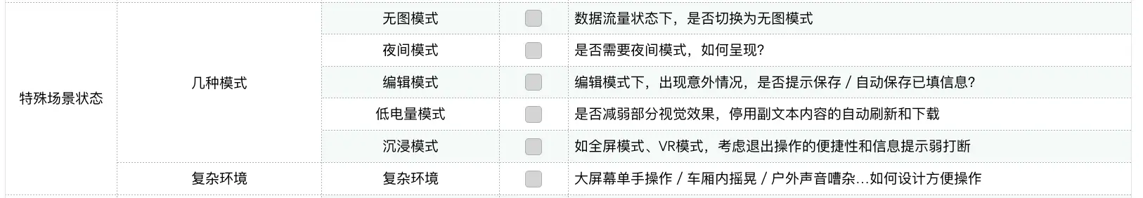 每个迭代版本做新功能时,我们可以把新增的影响因素添加进去,留待后续的交互设计自查。这样积累下来,我们提前考虑到的异常点就会越来越多,从而考虑得会越来越完善,效率越来越高。