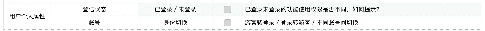在大多数应用中,每个用户都有自己账号,用户登录与未登录,所享受的权限也不尽相同。所以要考虑到用户的所有可能有的状态,以及状态间的切换对于设计时的影响。