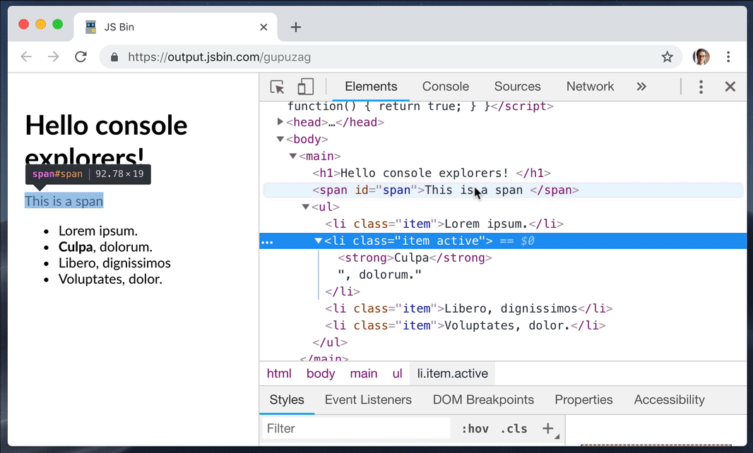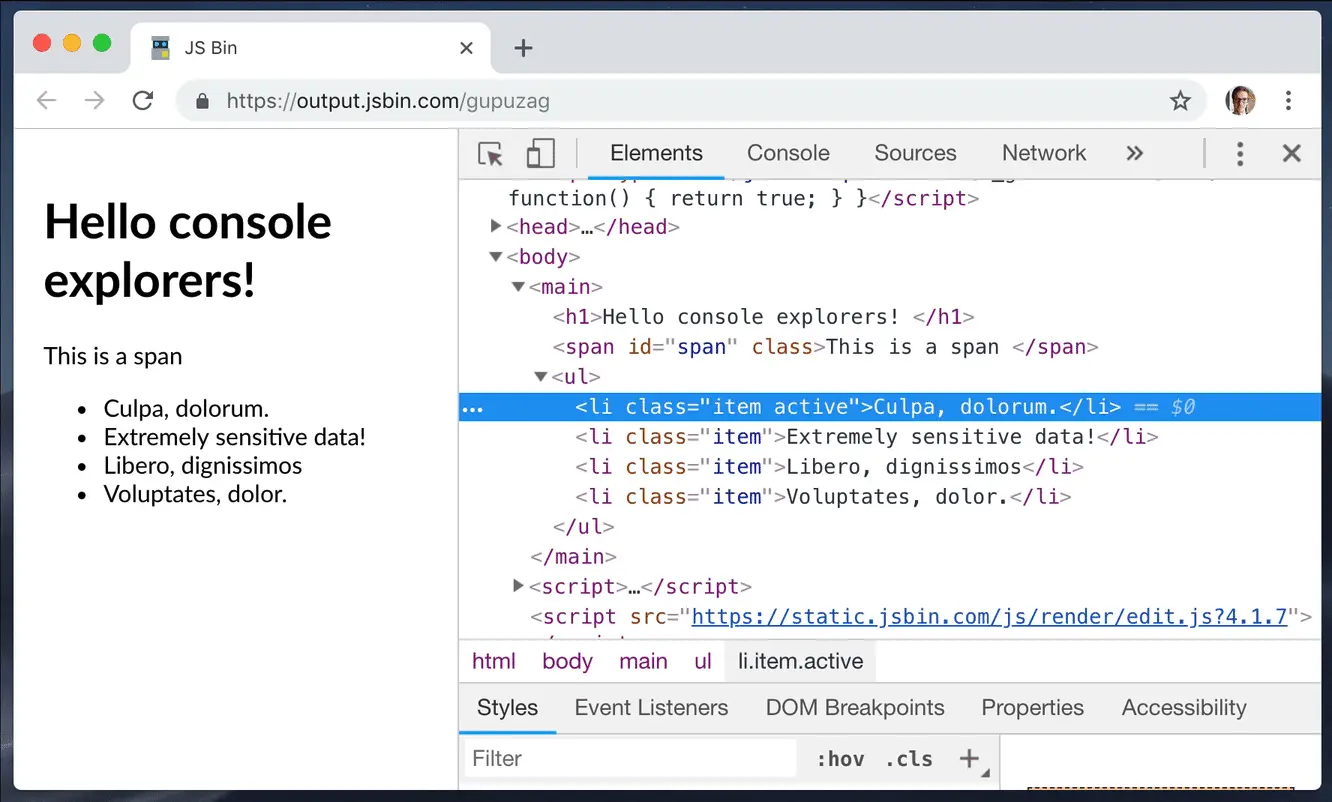 所以一旦我们在 Elements 面板中弄乱了我们的 HTML 结构,我们不应该感到惊讶。