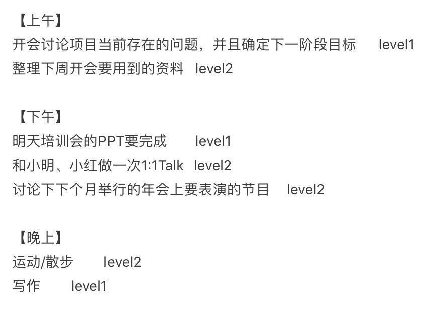 那么你可能会问,我该安排多少LEVEL 2的事情呢?z哥我自己一般每天的LEVEL 1和LEVEL 2是一个55开的比例。可能像春节前后这种相对稳定的时期,会加到8:2的样子。大家可以根据自己的状态,找到一个比较合适的比例。