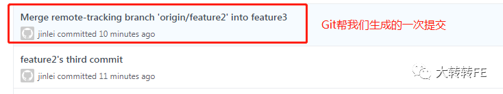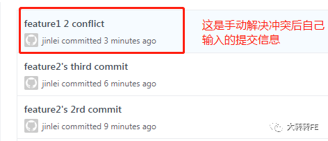 在遇到冲突时,git并不会自动为我们生成一个commit记录,而是我们修改完后自己去提交这个记录,例如上面冲突修改之后直接commit再push,在远端仓库我们看到的记录是:
