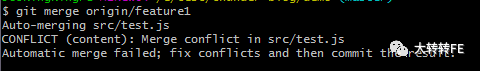 例如我从上图2的位置新建了分支feature1,commit4和5修改了src/test.js文件,同时在master分支的commit3中也修改了src/test.js文件,这时我在master上merge远端的分支feature1