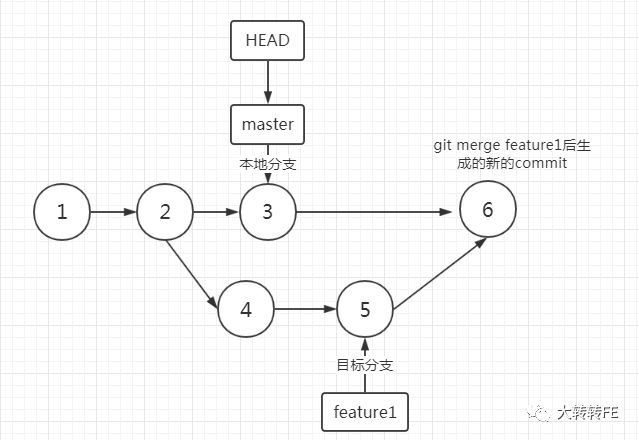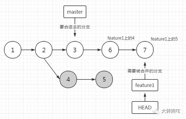 如果当前分支的所有提交另一个分支都包含,就是在上图2的位置合并feature1的内容,这时其实commit记录也就还是一条线,1245,所以把本地的HEAD和分支(例子中是master)也指向feature1的最新commit记录5就可以了。