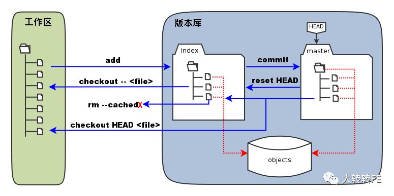 通常每次有一条新的commit记录时,工作目录会与这条最新的commit对应,HEAD指针也会指向它(在使用checkout reset等操作切换当前工作目录对应的commit时,HEAD也会跟过去,后面会说)