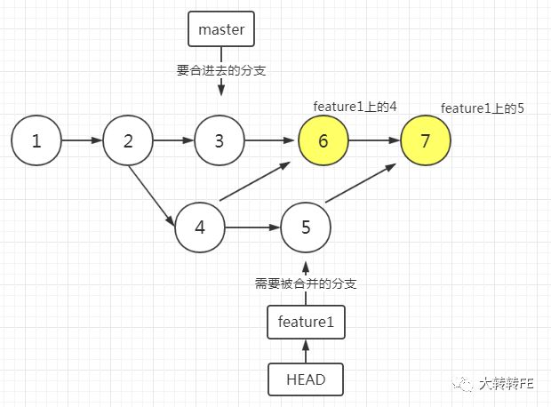 将feature1分支上的两个commit记录4和5与本地分支上最新的commit3合并并生成了一个新的commit,如图中的6