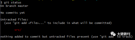 untracked files表示未追踪的文件,就是新创建的src文件夹,未追踪的意思就是当前本地git仓库对它没有任何的记录,对本地仓库来说是不存在的,在我们提交代码的时候也不会提交上去,这时就用到了add命令