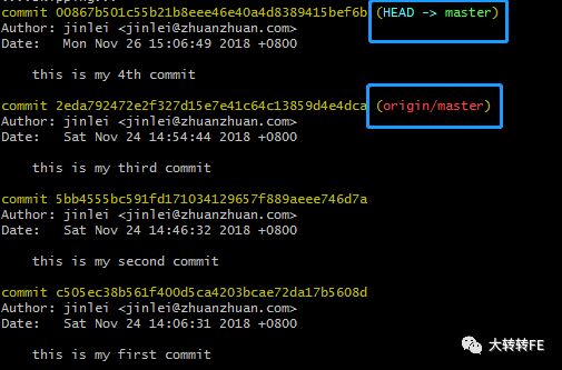 如图,我们commit了最新的提交信息还没push到远端时,本地的HEAD指向我们最新的提交,而远端仓库的还停留在之前的那条commit记录,origin/master指向它。