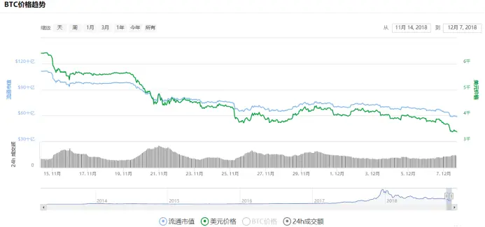 今日的价格为23,327人民币,24小时的涨幅为-12.27%。比特币从2018年11月14号,开始下跌,到今天还没有真正触底,近一个月的时间跌幅率近50%。