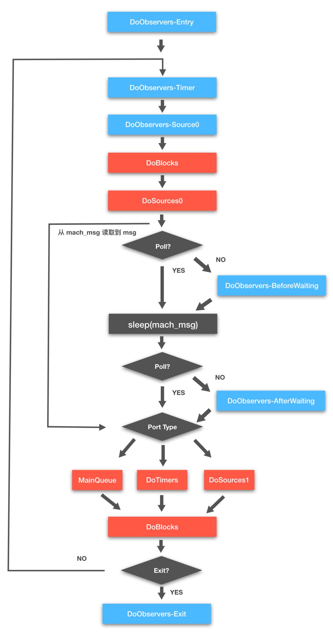 至此,我们已将 runloop 中的关键代码分为了三类,并就这三类进行了展开,接下来我们看下完整的流程。