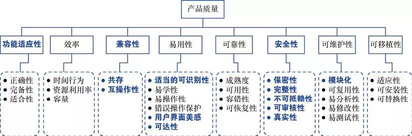 根据国际标准IEEE 24765-2010,产品质量是指在特定的使用条件下产品满足明示的和隐含的需求所明确具备能力的全部固有特性。而根据ISO 25010:2011标准,质量模型从原来的6个特性增加到8个特性,新增加了“安全性、兼容性”。如图1-2所示,蓝色标注的内容属于新增加或改动的内容。这里的安全性是指信息安全性(Security),原来放在“功能性”下面,但现在绝大部分产品都是网络产品,安全性越来越重要,所以有必要作为单独的一个维度来度量。今天系统互联互通已经很普遍,其次终端设备越来越多,除了传统的PC机,还有许多智能移动设备,如手机、平板电脑、智能手环、智能手表等,这些都要求系统具有良好的兼容性。这些特性就对应着测试类型,如功能测试、性能测试(效率)、兼容性测试、安全性测试等。