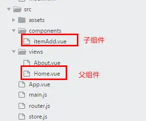 1、先看下目录体系,下图子组件放在components文件夹内,模拟子组件为itemAdd.vue,父组件视图放在views文件夹内,模拟父组件名称为Home.vue。