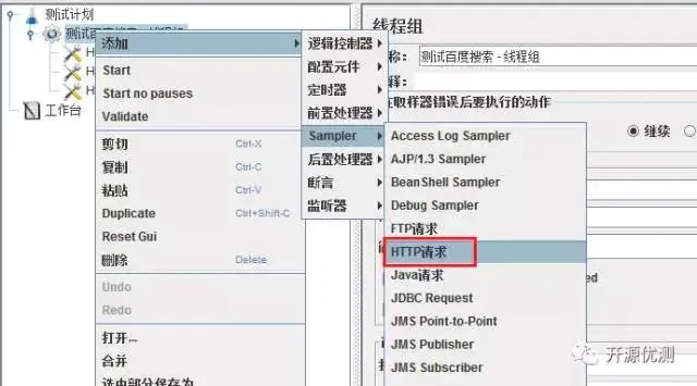 添加HTTP Request元组 在线程组上右击新增HTTP请求,如图: