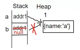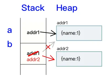 var b = a时,是将a中的addr1地址复制放到b的stack中。当运行b = {name: 'b'}时是在heap中重新开出一块放置{name: 'b'}且地址为2,并且b的地址更改为addr2。这个时候b指向addr1的作废,重新指向2。所以这个时候a还是原来的。即a.name的结果是"a"。