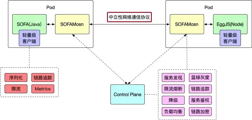 因此,我们希望能够演化出这样一套多语言通信的方案,它能够以 Service Mesh 为基础,但是我们也会做适当地妥协去弥补因为上了 Service Mesh 之后的一些能力的缺失。首先我们希望有一个语言中立的高效的通信协议,每个语言都能够非常简单地理解这个协议,这个是在一个跨语言的 RPC 通信中避免不了的,无论是否采用 Service Mesh。然后,我们希望将大部分的能力都下沉到 Sidecar 里面去,包括服务发现,蓝绿发布,灰度发布,限流熔断,服务鉴权等等能力,然后通过统一的控制平面去控制 Sidecar。然后,因为 Service Mesh 化之后的一些能力缺失,再通过一些轻量化的客户端去实现,这些能力包括序列化,链路追踪,限流,Metrics 等等。