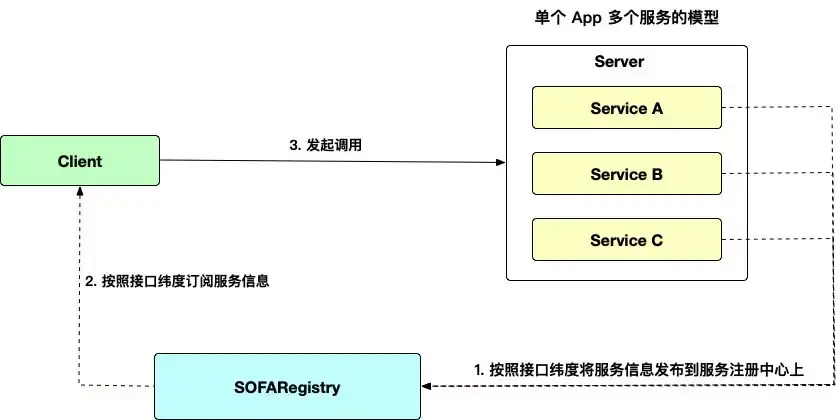 我们可以先看下左边的这张图,左边的这张图是 SOFARPC 当前的服务发现的模型,和大家看到的国内的一些开源的 RPC 框架基本上类似,因为最早 SOFARPC 就是为了方便 Java 而设计的,所以也是设计成尽量让服务调用和本地调用一样,而服务发现的粒度也是接口的维度,也就是说当一个应用要调用另一个应用发布的服务的时候,它是按照服务的接口信息从服务注册中心上去寻找服务的提供方的地址的,并且服务的提供方也是按照接口来将服务注册到服务注册中心下的。在蚂蚁金服里面,大部分的情况下,同一个应用的不同的实例提供了的服务的是一模一样的,但是也有一些情况下,同一个应用的不同的实例提供了不同的服务。