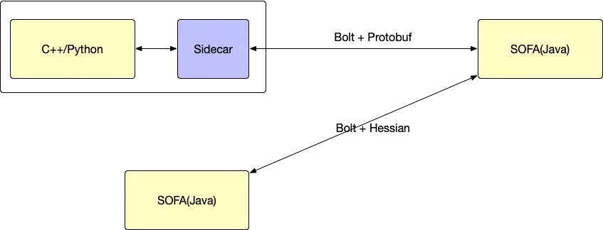 再到最近几年,随着 AI 的兴起,在蚂蚁金服也越来越多地出现 CPP,Python 等系统,而由于 CPP 和 Python 等等语言,在蚂蚁金服并没有一个独立的基础设施团队去研发对应的中间件,因此,他们和基于 Java 的 SOFA 应用的互通就降级成了直接采用 HTTP 来通信,这种方式虽然也可以 Work,但是在通信基础之上的服务调用的能力却完全没有,和原本的 SOFA 的基础设施也完全没法连接在一起。