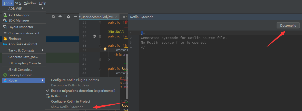 在AndroidStudio中点击Tools-Kotlin-Show Kotlin Bytecode会出现字节码,再点击Decompile能看到反编译的java文件