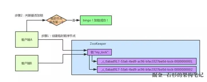 参见上图。ZK 里有一把锁,这个锁就是 ZK 上的一个节点。两个客户端都要来获取这个锁,具体是怎么来获取呢?