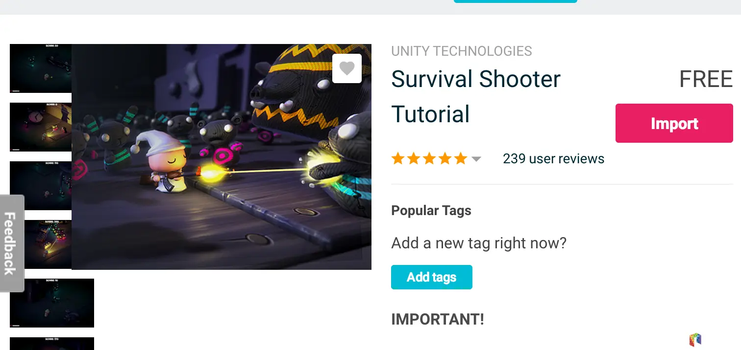 单击菜单选项 窗口(Window) – > 通用 (General) – > 资产存储 (Asset Store)并搜索Survival Shooter Tutorial。 选择它然后单击下载 (Download),然后单击导入(Import)。