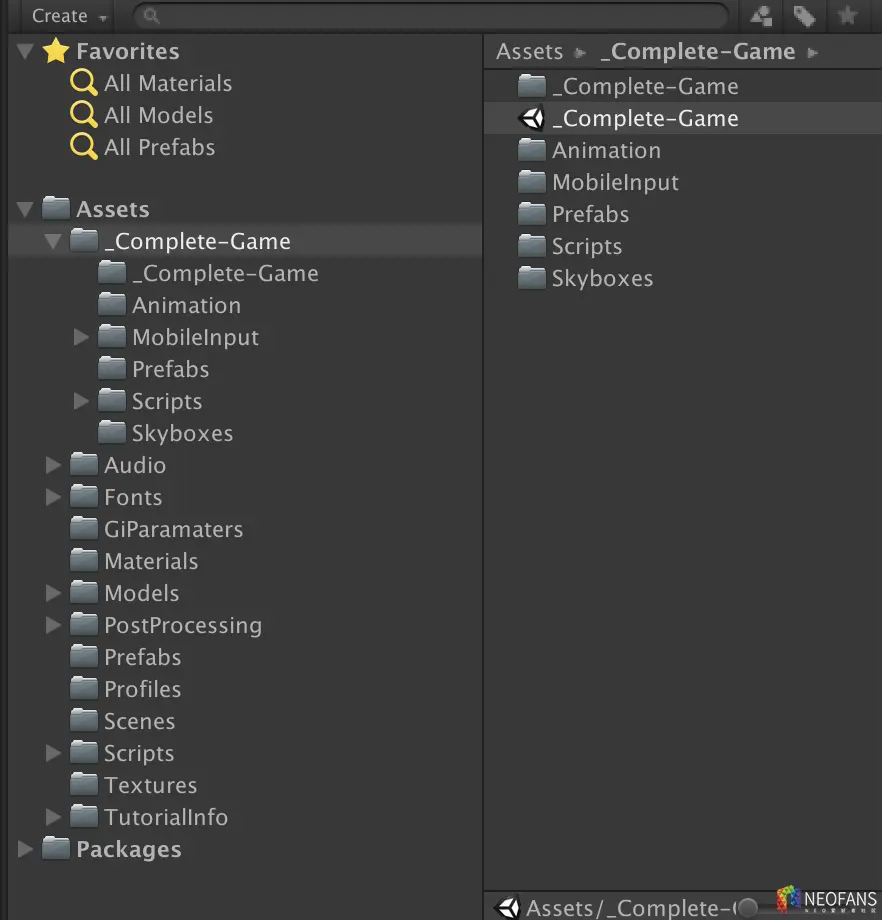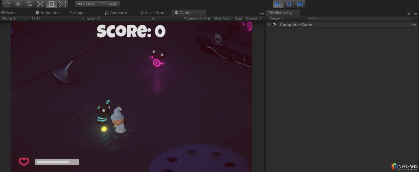 哇,你已经创建了一个游戏! 在项目窗口(Project Window)中打开主场景 资产(Assets)- > _Complete-Game – > _Complete-Game(scene),然后点击 播放(Play) 按钮以查看它的实际效果。 你可以使用键盘上的WASD键移动并使用鼠标进行瞄准和射击。