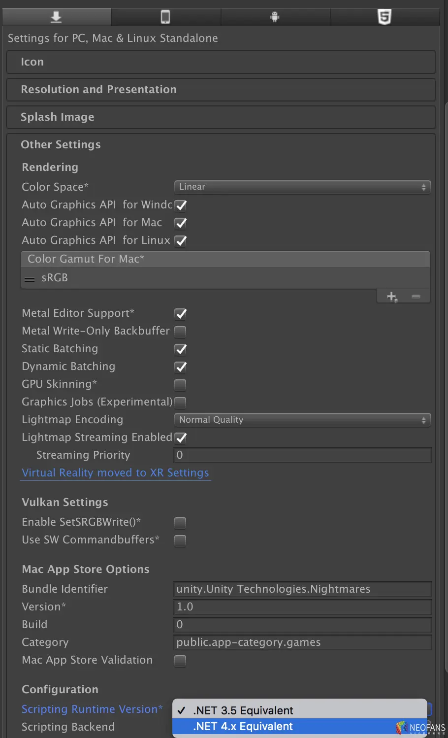 要开始使用NEO区块链,我们需要进行更多的设置。我们用于与NEO区块链交互的插件需要更新版本的微软.NET框架,而不是Unity中默认设置的版本。转到 编辑 (Edit)- >项目设置 (Project Settings)- >播放器 (Player),然后在 其他设置 (Other Settings)下将 脚本运行时版本(Scripting Runtime Version)设置为.NET 4.x Equivalent。 你会看到一个弹出窗口,要求重新启动编辑器,继续并接受从而重启。