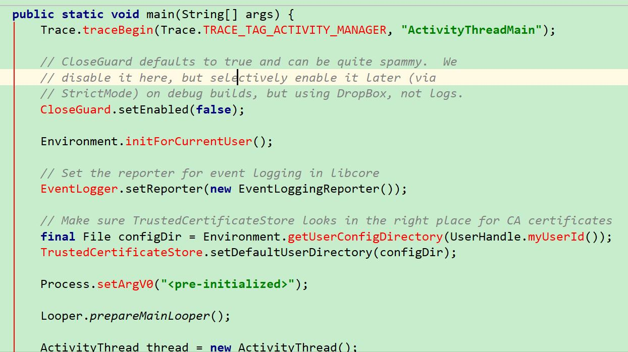 我们都知道,Activity 是有生命周期的,onCreate()、onStart() 、onResume 等等那么这些方法是如何调用的呢?它不会平白无故的自己调用。其实当我们开启 APP 的时候会创建一个叫做 ActivityThread 的类,我们可以认为这个类是主类,就和 Java 程序中的启动类一样,ActivityThread 类有一个 main 函数,这个函数就是我们的程序入口!