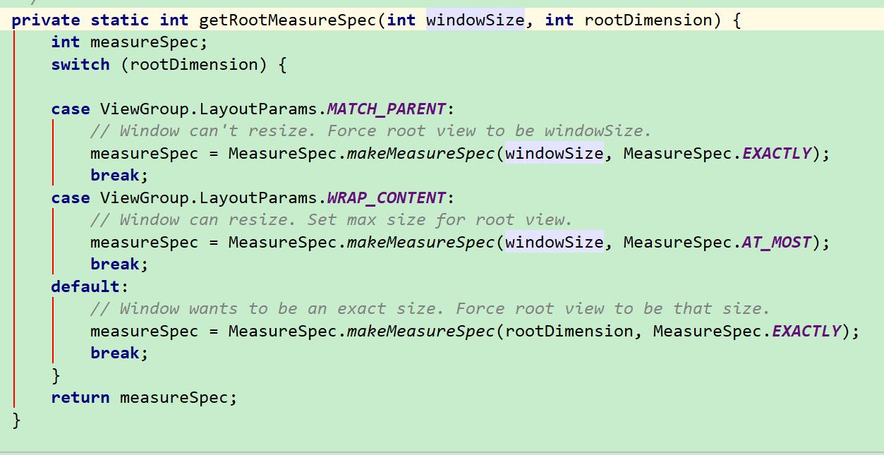 通过这一步:mView.measure(childWidthMeasureSpec,childHeightMeasureSpec) 就是给 mView 确定大小值了,也就是根 View。