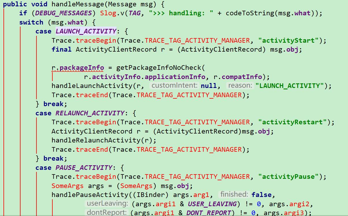 这个就是 ActivityThread 中 Handler 的部分代码实现,然后看到 Handler 里面的这段代码