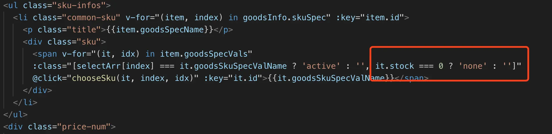 if (it.stock === 0) return // 判断库存为0时返回