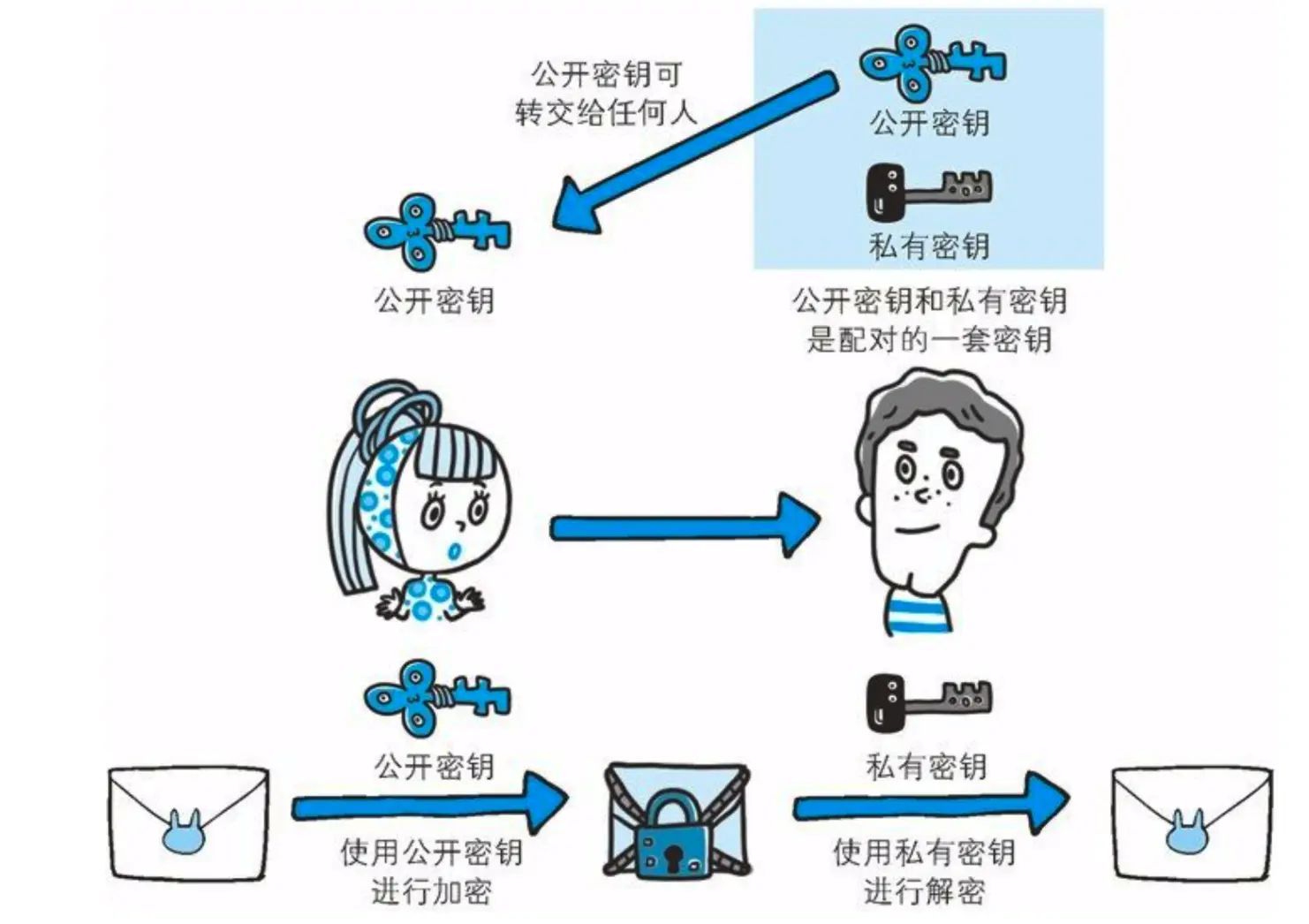 公开密钥加密使用一对非对称的密钥。一把叫做私有密钥,一把叫做公开密钥。私有密钥保密,公开密钥可以随意发布,任何人都可以获得。发送密文的一方使用对方的公开密钥进行加密处理。对方收到被加密的信息后,在使用自己的私有密钥进行解密。无需发送私有密钥,也就断绝了被盗走的可能。