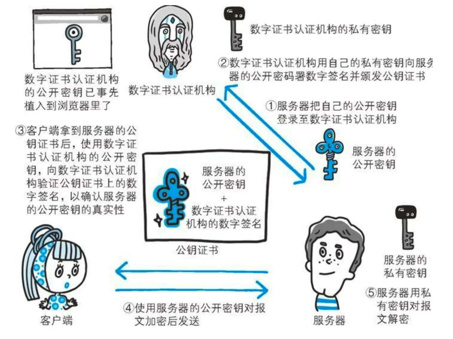 服务器的运营人员向数字证书认证机构提出公开密钥的申请,数字证书认证机构在判明提出申请者的身份后,会对已申请的公开密钥做数字签名,然后分配这个已签名的公开密钥,并将该公开密钥放入公钥证书后绑定在一起。