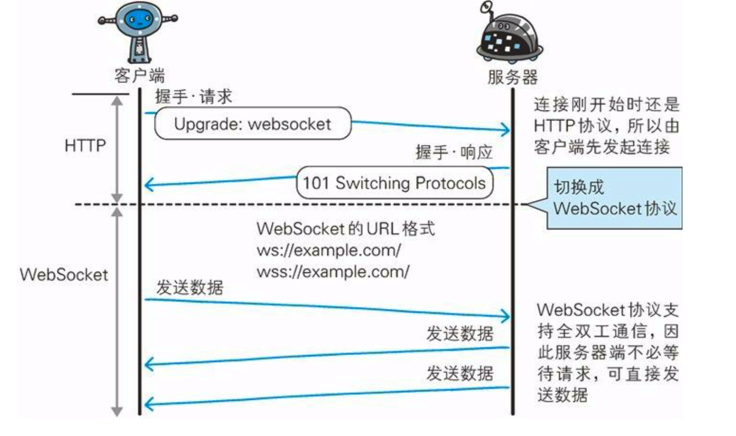 WebSocket是建立在HTTP基础上的协议,因此连接的发起方仍是客户端,而一旦确立WebSocket通信连接,不论服务器还是客户端,任意一方都可直接向对方发送报文。