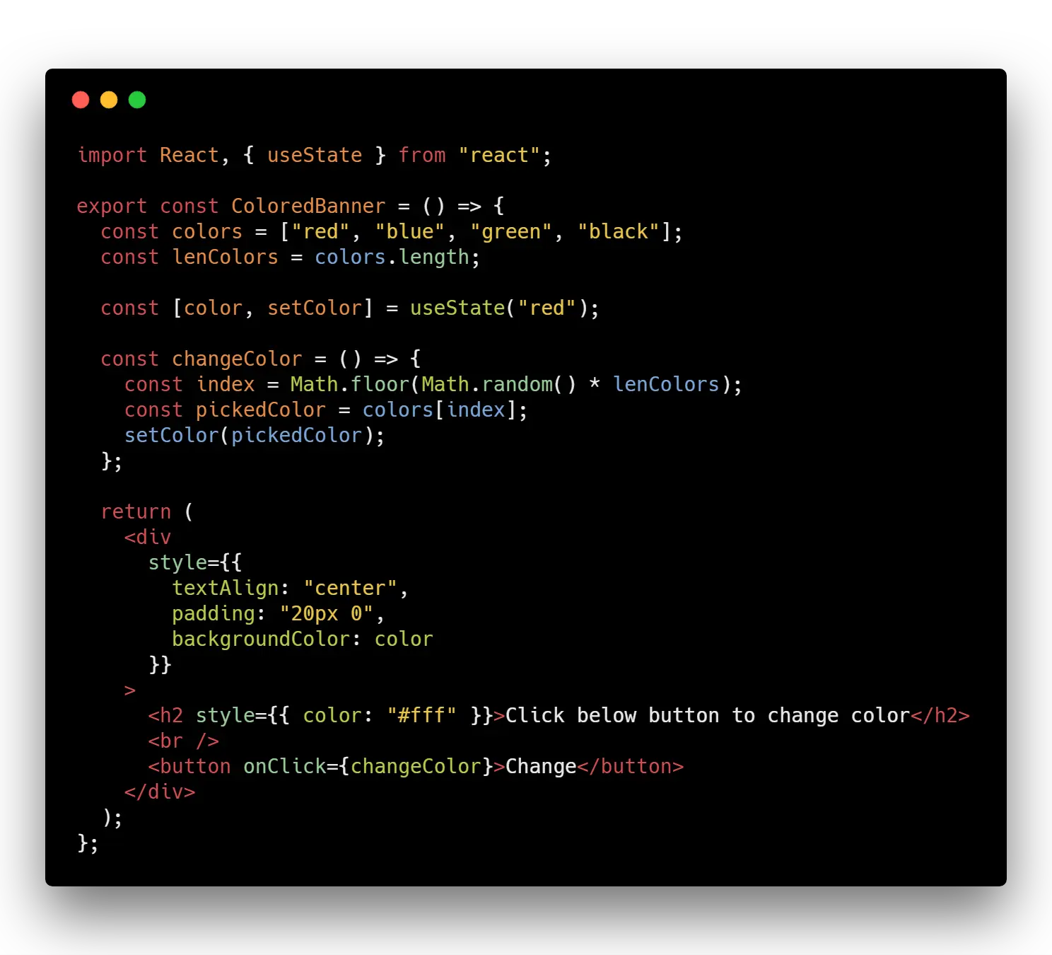 我们来写一个组件,取名叫 ColoredBanner,它可以通过点击按钮随机改变背景颜色: