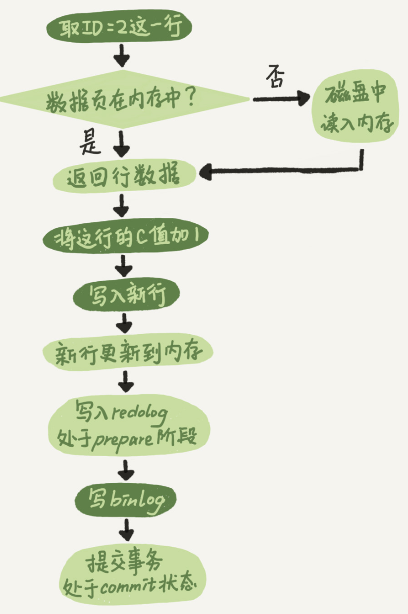 - 执行器拿到引擎给的行数据,把这个值加上 1,比如原来是 N,现在就是 N+1,得到新的一行数据,再调用引擎接口写入这行新数据。