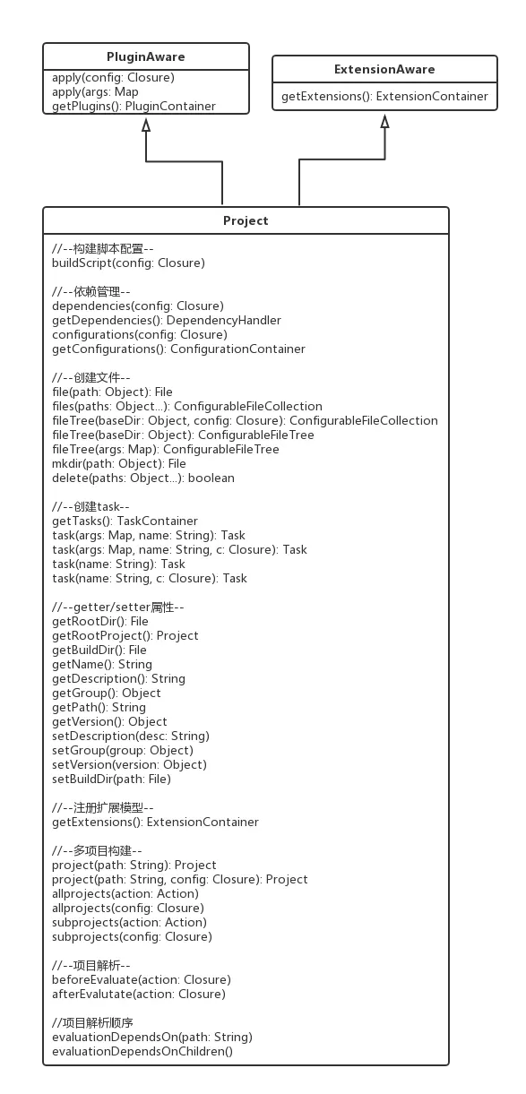 当构建进程启动后,Gradle基于build.gradle中的配置实例化org.gradle.api.Project类,先来看看 Project 类的主要结构(节选部分常用):