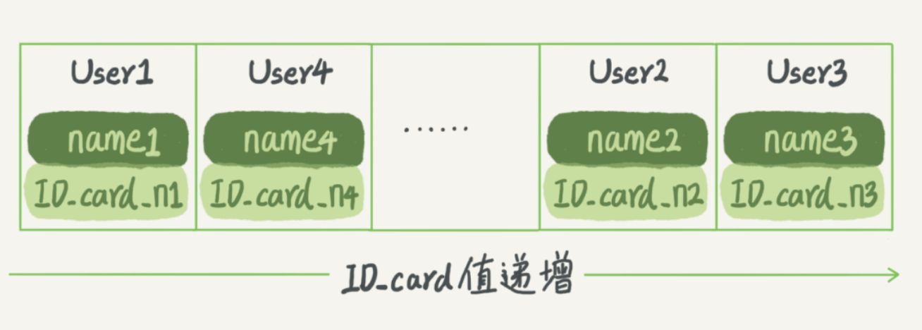 - 需要注意的是,图中四个 ID_card_n 的值并不是递增的,这样做的好处是增加新的 User 时速度会很快,只需要往后追加。但缺点是,因为不是有序的,所以哈希索引做区间查询的速度是很慢的。