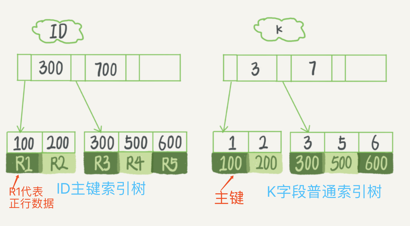 - 非主键索引的叶子节点内容是主键的值。在 InnoDB 里,非主键索引也被称为二级索引(secondary index)。