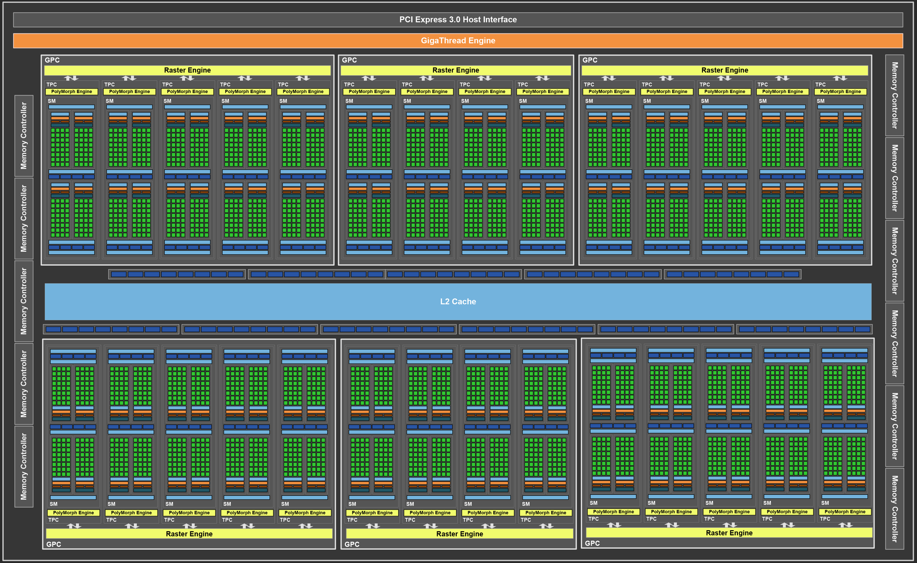 - 如下图所示,在一块1080ti上有28个SM,每个SM上有128个core,合计3584个cuda core。