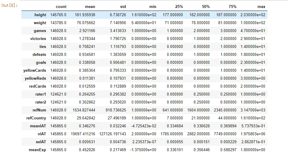 all_columns ['playerShort', 'player', 'club', 'leagueCountry', 'birthday', 'height', 'weight', 'position', 'games', 'victories', 'ties', 'defeats', 'goals', 'yellowCards', 'yellowReds', 'redCards', 'photoID', 'rater1', 'rater2', 'refNum', 'refCountry', 'Alpha_3', 'meanIAT', 'nIAT', 'seIAT', 'meanExp', 'nExp', 'seExp'] -