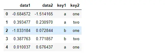 df2 = pd.DataFrame({'key1':['a', 'a', 'b', 'b', 'a'], 'key2':['one', 'two', 'one', 'two', 'one'], 'data1':np.random.randn(5), 'data2':np.random.randn(5)})