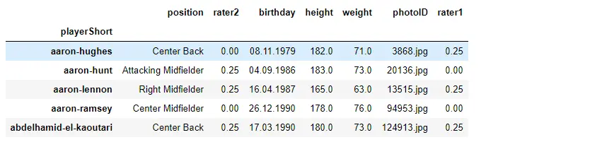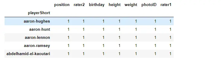 def get_subgroup(dataframe, g_index, g_columns): g = dataframe.groupby(g_index).agg({col:'nunique' for col in g_columns}) if g[g > 1].dropna().shape[0] != 0: print("Warning: you probably assumed this had all unique values but it doesn't.") return dataframe.groupby(g_index).agg({col:'max' for col in g_columns}) players = get_subgroup(df, player_index, player_cols) players.head()