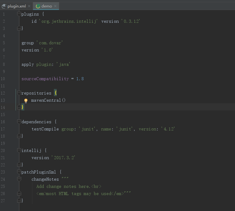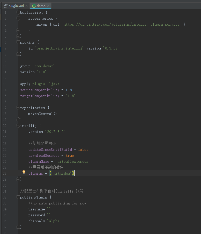 接下来我们主要关注两个文件,就是上图中的build.gradle和plugin.xml。