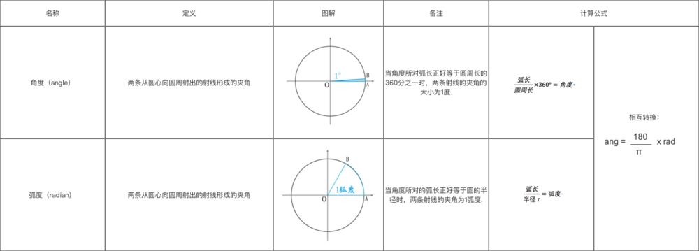 角度和弧度都是描述角的一种度量单位,区别如下图: