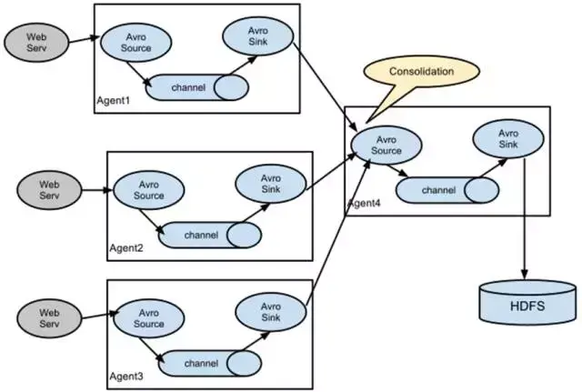 多个Agent的数据汇聚到同一个Agent:这种情况应用的场景比较多,适用于数据源分散的分布式系统中数据流汇总。