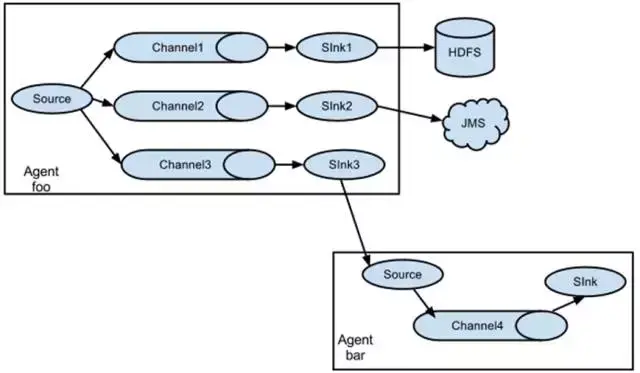 多个Agent顺序连接:将多个Agent顺序连接起来,将最初的数据源经过收集,存储到最终的存储系统中。一般情况下,应该控制这种顺序连接的Agent的数量,因为数据流经的路径变长了,如果不考虑Failover的话,出现故障将影响整个Flow上的Agent收集服务。