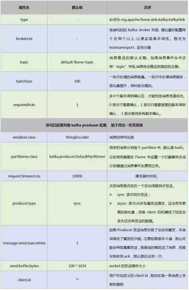 agent1.sinks.kafkasink.type = org.apache.flume.sink.kafka.KafkaSink agent1.sinks.kafkasink.brokerList=zdh100:9092, zdh101:9092,zdh102:9092 agent1.sinks.kafkasink.topic=mytopic agent1.sinks.kafkasink.requiredAcks = 1 agent1.sinks.kafkasink.batchSize = 20 agent1.sinks.kafkasink.channel = memcnl