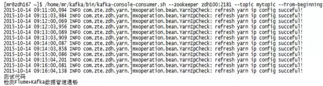 /home/mr/kafka/bin/kafka-console-consumer.sh --zookeeper zdh100:2181 --topic mytopic --from-beginning 输出结果如下: