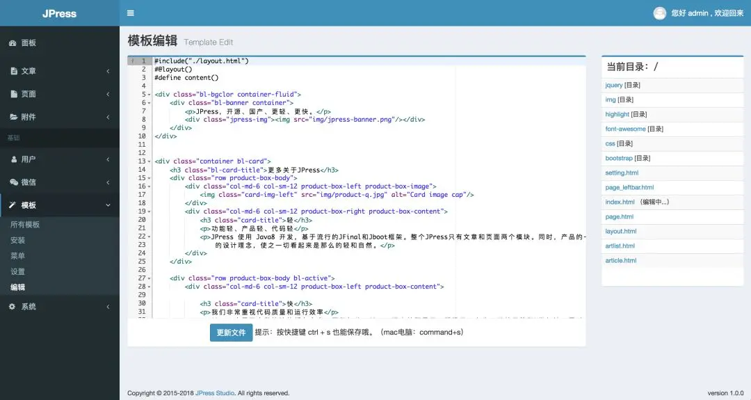 项目简介:JPress 使用 Java8 开发,基于流行的 JFinal 和 Jboot 框架。整个JPress只有文章和页面两个模块。JPress 内置了多种快速的缓存方案,不仅如此,JPress 还支持阿里云、腾讯云、七牛、又拍云等 CDN 做加速。