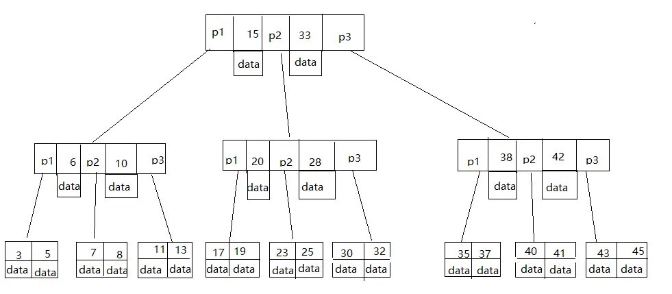 3、每一个叶子节点都包含k-1个元素,其中 ceil(m/2) ≤ k ≤ m